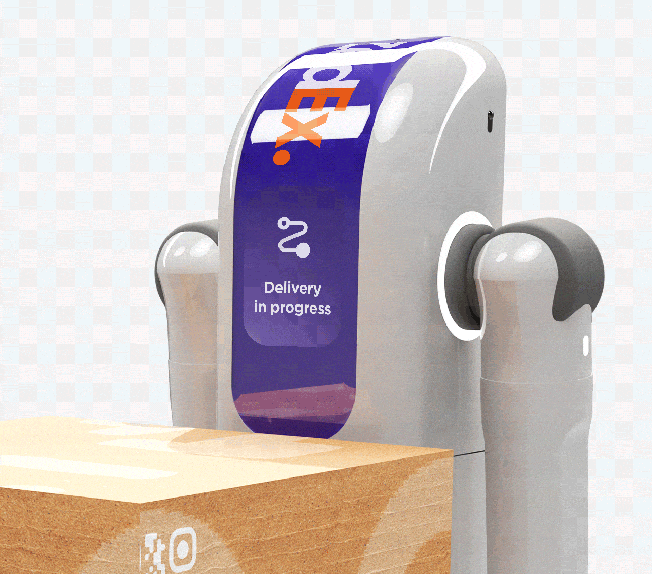 A long display cascades over the bot's front surface, providing a large canvas for branding and communications. Along the commute, "Delivery in progress" is displayed to inform people nearby.