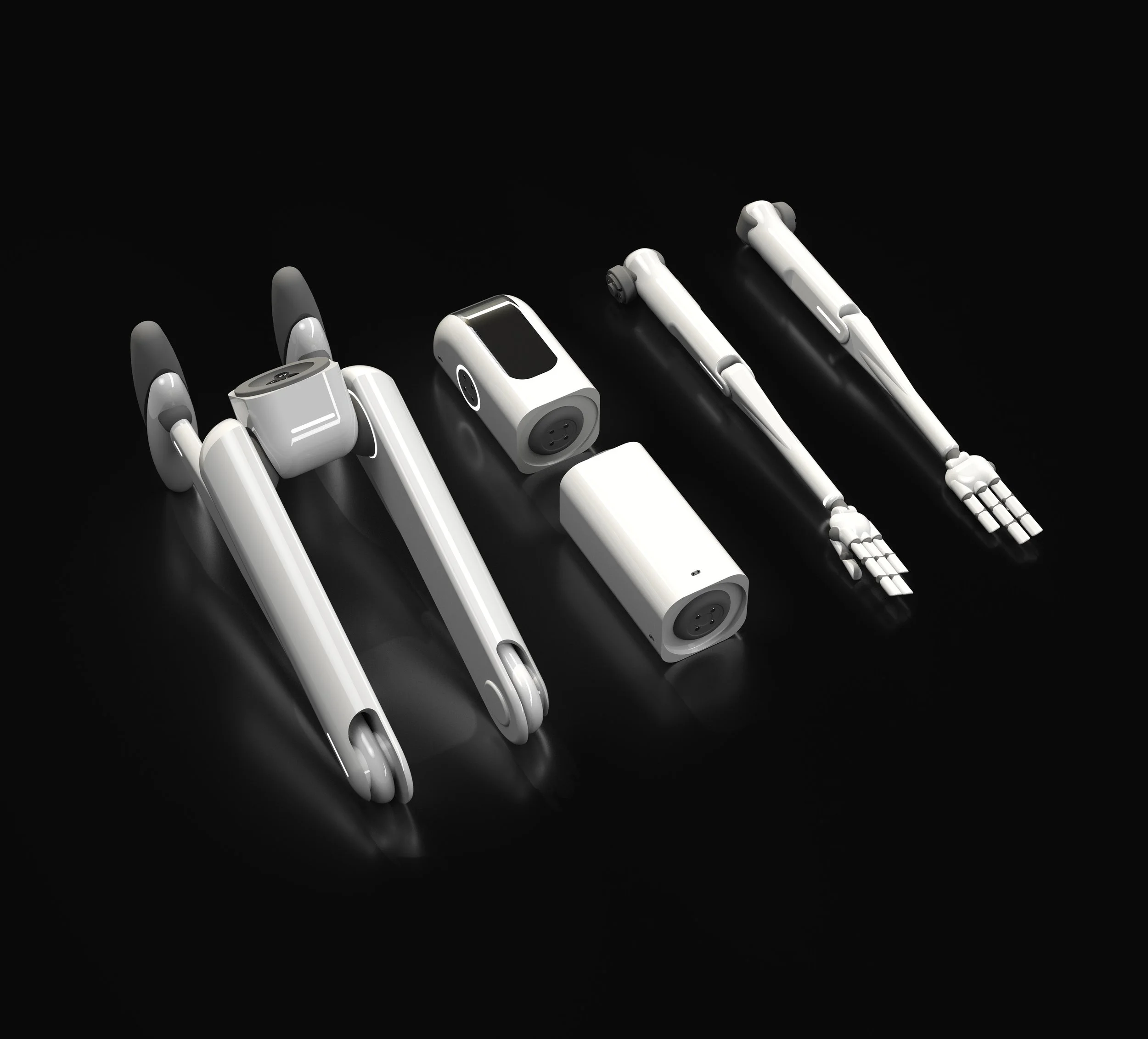 The base of a modular robot would likely be a set of arms and a brain. Aside from that, each use case might call for legs, wheels or other mobility variations. For example, a bot that hangs might not need a battery core as it would move around a kitchen on a track with consistent power.