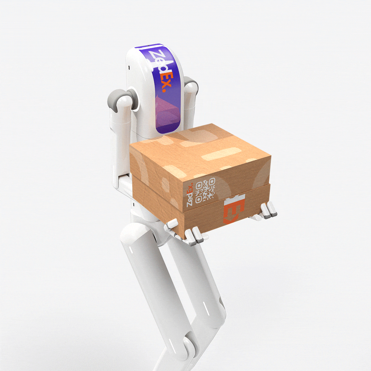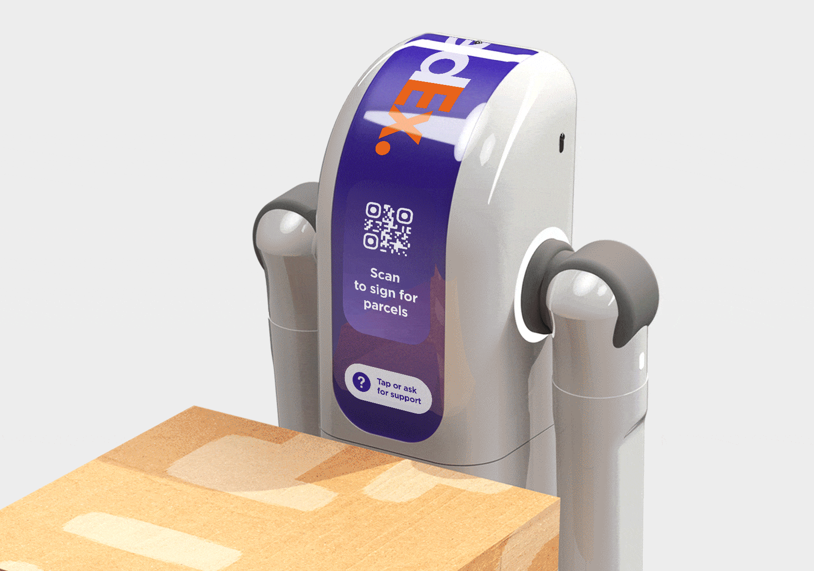 You open the front door to a compact humanoid presenting your parcels. The branding on the front display slides back to reveal your unique delivery code.